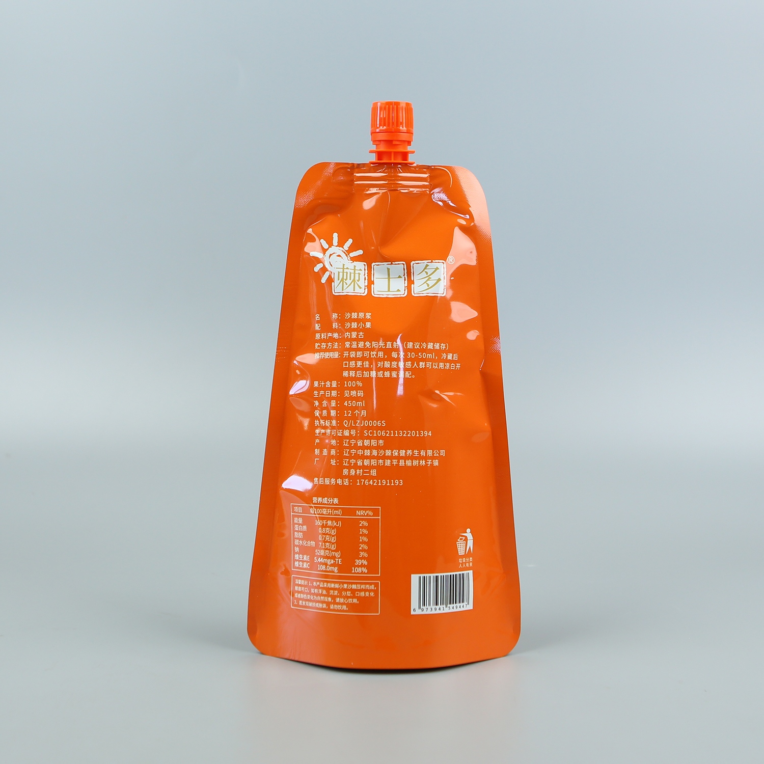 产品名称:450ml沙棘原浆+亮面铝箔水煮+异形自立带吸嘴