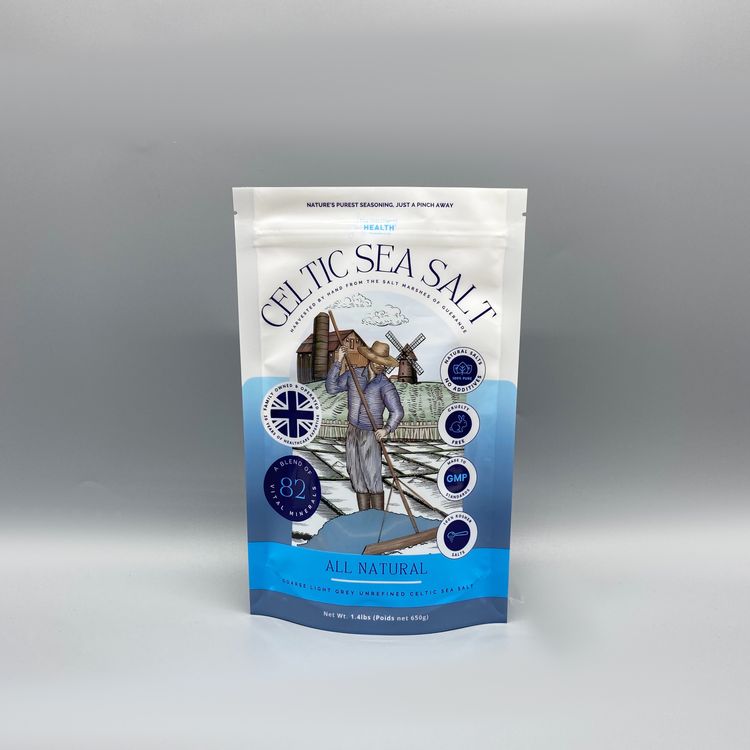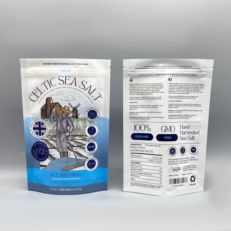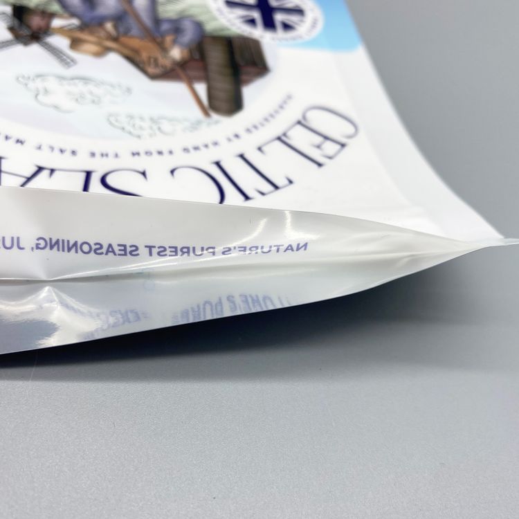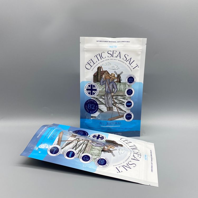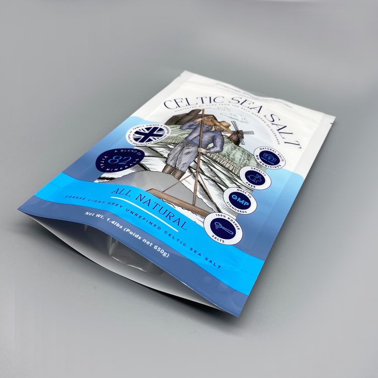 海盐袋采用自立拉链袋设计,这种袋型能够稳固地站立