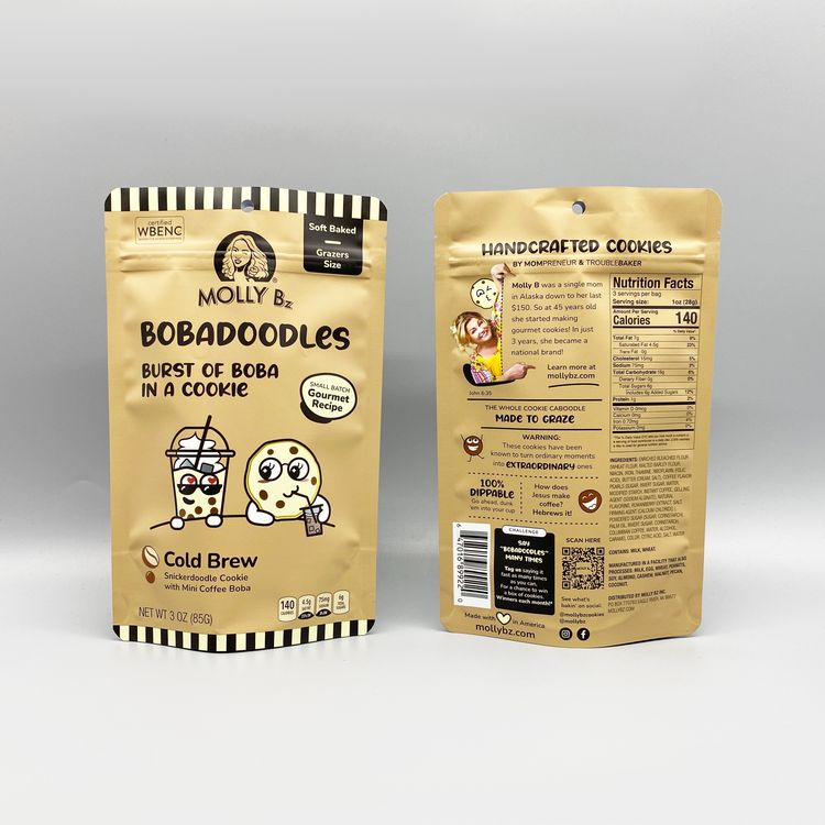这种袋型以其独特的自立能力,确保了饼干在货架上的醒目展示