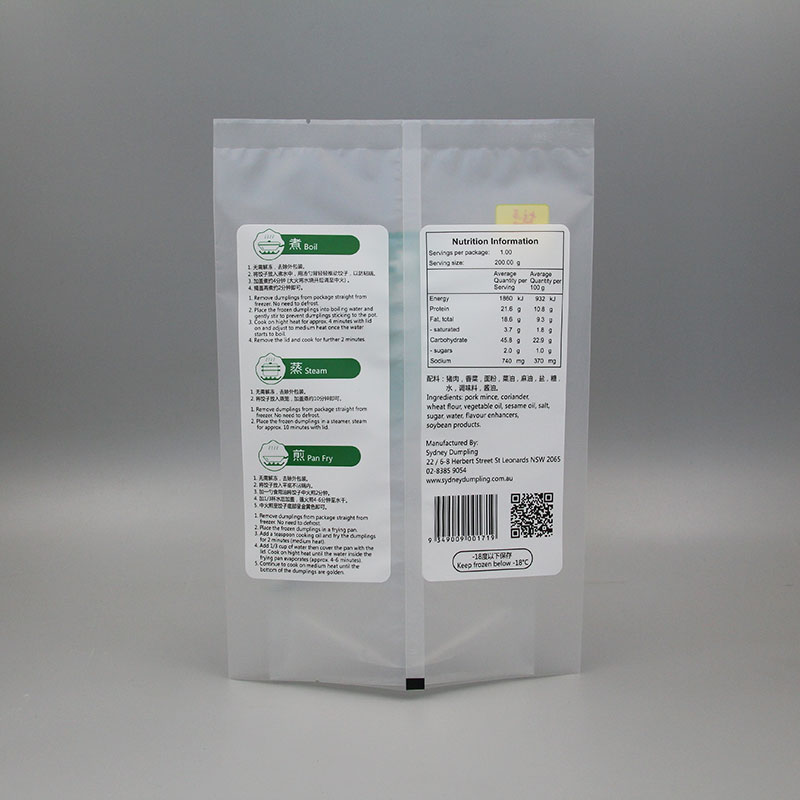 本产品为哑光塑料复合冷冻 背封袋 ,简单印刷,大面积透明包装,体现出简洁的特点,同时降低印刷成本,为公司带来更高的利润空间。背封袋结合了四边封袋多列同时包装速度快和