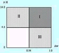 在日本,根据厚生省告示第 17 号“容器包装、充填加压加热杀菌食品”的标准中被定义为 如图 1 所示 pH 值超过 4.6 、且水分活性超过 0.94 的范围,在充填该类食品进行加热加压时,必须对中心部采取以 120 ℃ 、加热 4 分钟的方法或与其具有同等效力以上的方法进行杀菌。