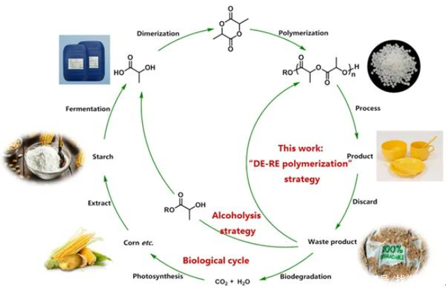 中国科学院青岛能源研究所研究员王庆刚带领的催化聚合与工程研究组发展出聚合物降解再聚合的升级化学循环新策略(“DE-RE polymerization”strategy),以“聚合物到聚合物”方式实现了聚乳酸废弃物到新聚乳酸材料的循环再利用过程。该策略反应条件温和,副反应少,减少了完全重新生产聚乳酸的原料消耗,提高了聚乳酸的回收再利用效率。在再聚合过程中,通过加入不同类型单体可以获得性质各异的最终材料。