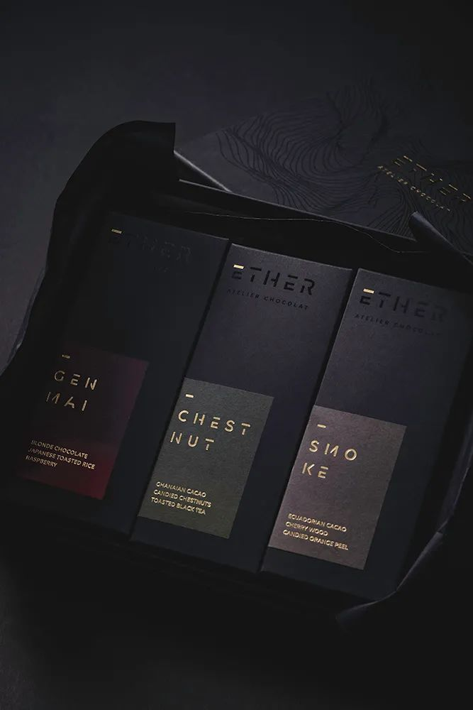 ether atelitr巧克力是来自印度的品牌,他的包装设计使用微妙的黑色和金色美学以及设计的版式反应巧克力的纯正,体现品牌轻奢的理念。丰富、安静的细节化处理,反映出该巧克力的手工精神和该品牌的市场唯一性。